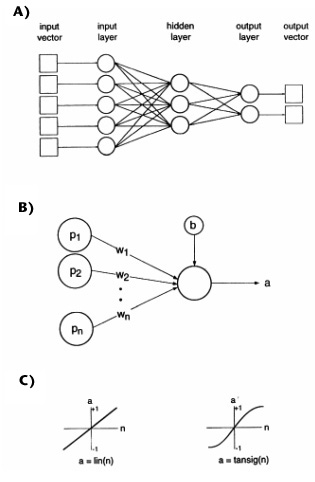 Figure 1. (A) Diagram showing the general architecture of a backpropagation (BP) network. Each neuron in the hidden and output layers receives weighted signals from the neurons in the previous layer. (B) Diagram showing the elements of a single neuron in a BP network. In forward propagation, the incoming signals from the neurons of the previous layer (p) are multiplied by the weights of the connections (w) and summed. The bias (b) is then added, and the resulting sum is filtered through the transfer function (C), linear or sigmoidal, to produce the activity of the neuron.