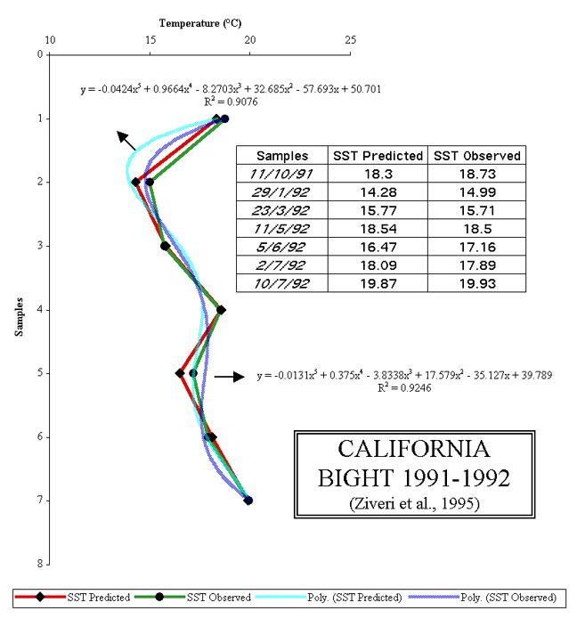 Figure 3. Relative abundances of nannoplankton species considered in this work and a chart showing the relationship between observed and predicted values of SST. Samples used as training sets are in italics. 'Poly.' in legend means: polynomial regression.