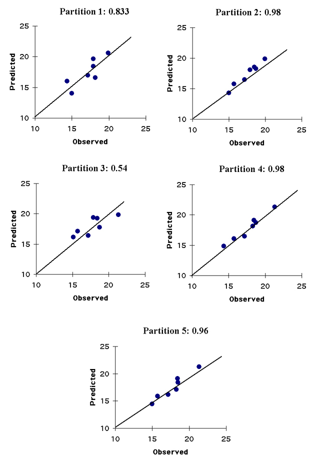 Figure 4. The correlation coefficients between observed and predicted SST's in the five test-sets of the Californian samples are as follows: Partition 1: 0.83; Partition 2: 0.98; Partition 3: 0.54; Partition 4: 0.98; and Partition 5: 0.96.