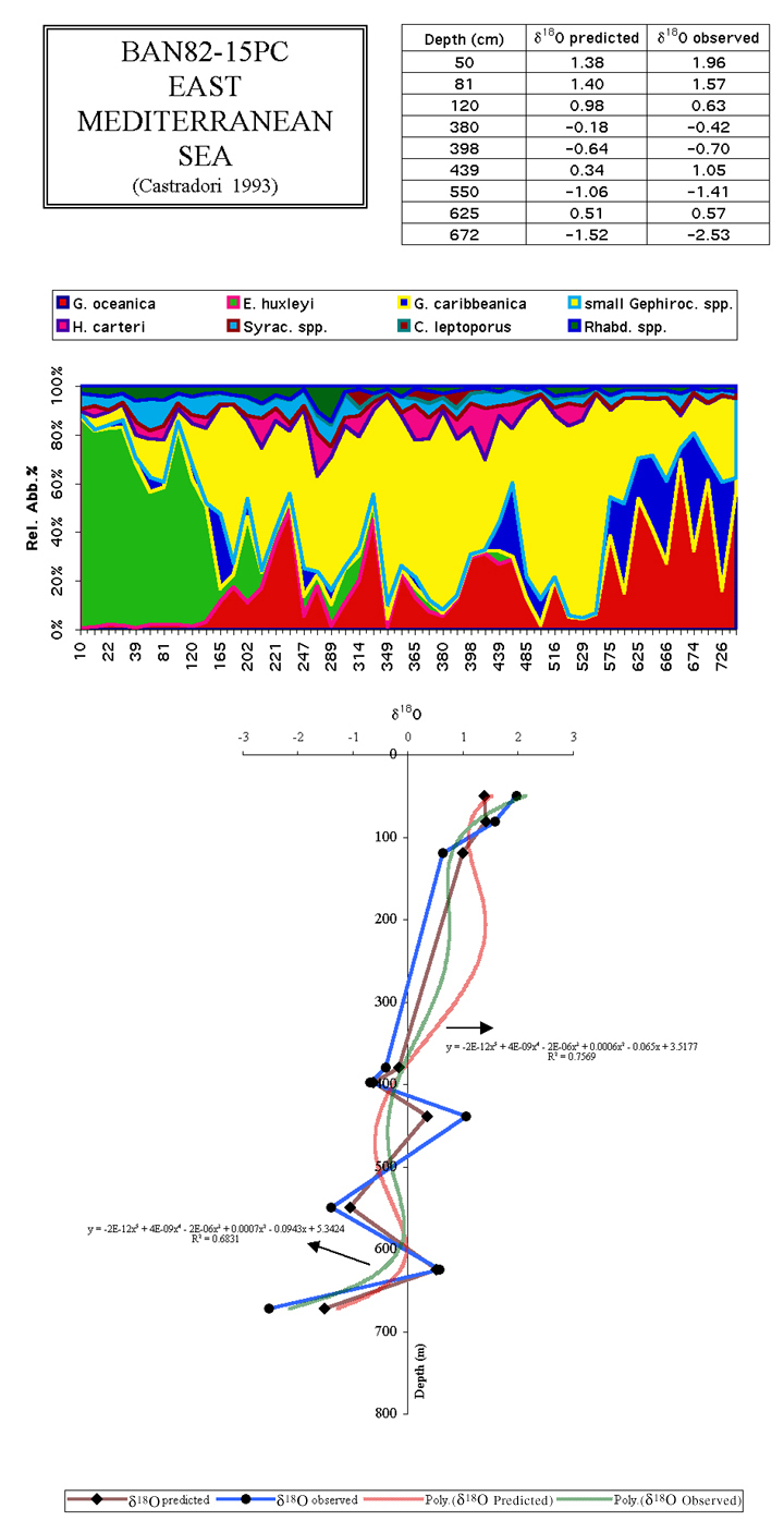 Figure 5. Relative abundances of nannofossil species considered in this work and a diagram showing the relationship between observed and predicted 18O. 'Poly.' in legend means: polynomial regression.