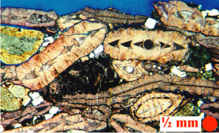 Figure 1. Images of some of the the key genera discussed in this report. 1.1. Axial section of Pellatispira Boussac 1906 from a sample from the east arm of Halmahera near Bicoli (Bitjoli). Image is 3 mm across. 1.2. In the same thin section as Pellatispira left are specimens of Alveolina d’Orbigny 1939 and Assilina d’Orbigny 1926 [s.l., this form referrable to Planocamerinoides Cole 1957 of some authors]. This is the flattened microfossil left of center in this image. 1.3. Assilina d’Orbigny 1926 [sensu lato, this form referrable to Planocamerinoides Cole 1957 of some authors]. Sample from the Bagelen Beds at Worowari, Central Java, personal collection. 1.4. Reproduced out of Douvillé 1912, from Nias. Assilina sp. This is now considered Assilina s.s. with no spiral sheets extending to the umbonal areas.