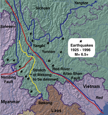 Figure 13. Major earthquakes in western Yunnan from 1925 to 1996 (data from the National Geophysical Data Center, map modified from Rand McNalley's New Millennium Atlas).