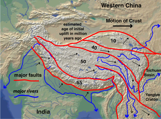 Figure 4. Major crustal blocks, age of uplift, and direction of motion in western China (adapted from Tapponier et al. 2001).