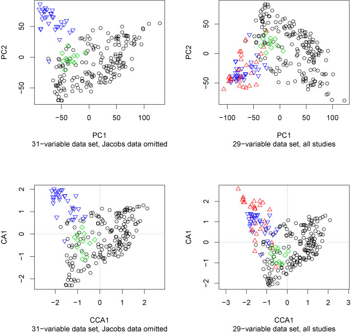 Figure 3. Principle components analysis biplots (top) and canonical correspondence analysis biplots (bottom) of the data. The left pair of biplots uses all 31 variables present in three of the studies; the right pair reduces the number of variables to 29 and shows all four studies. Note the basic similarity between the PCA and CCA plots: the scatters of points are viewed from different angles, but the relationships between studies are similar.
