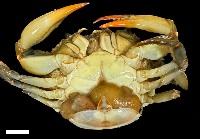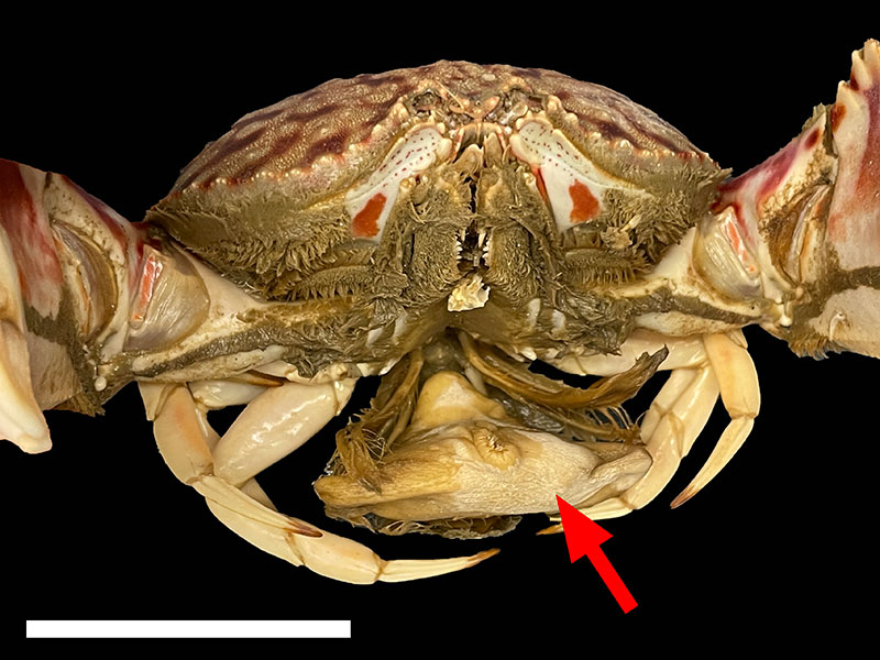 FIGURE 1. Calappa flammea (Herbst, 1794) from the Gulf of Mexico shelf with red arrow indicating visible externa of a parasitic rhizocephalan barnacle in the family Sacculinidae. Specimen stored in the collections of the Florida FWC Fish and Wildlife Research Institute in St. Petersburg, Florida, United States of America (Cat. no. FSBC I 138881 and 138882). Scale bar is 5cm.