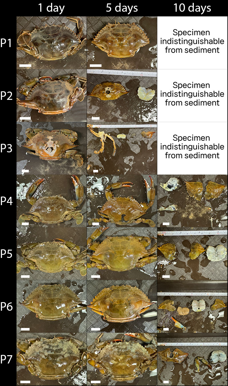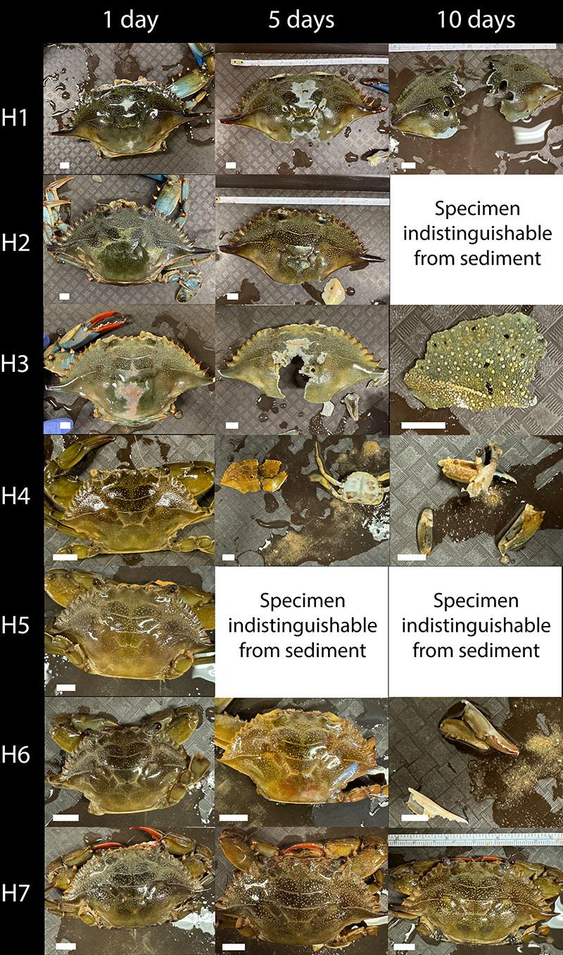 FIGURE 4. Callinectes sapidus (Rathbun, 1896) specimens without rhizocephalan parasites after one, five, and ten consecutive days of tumbling. Scale bars are 1cm.